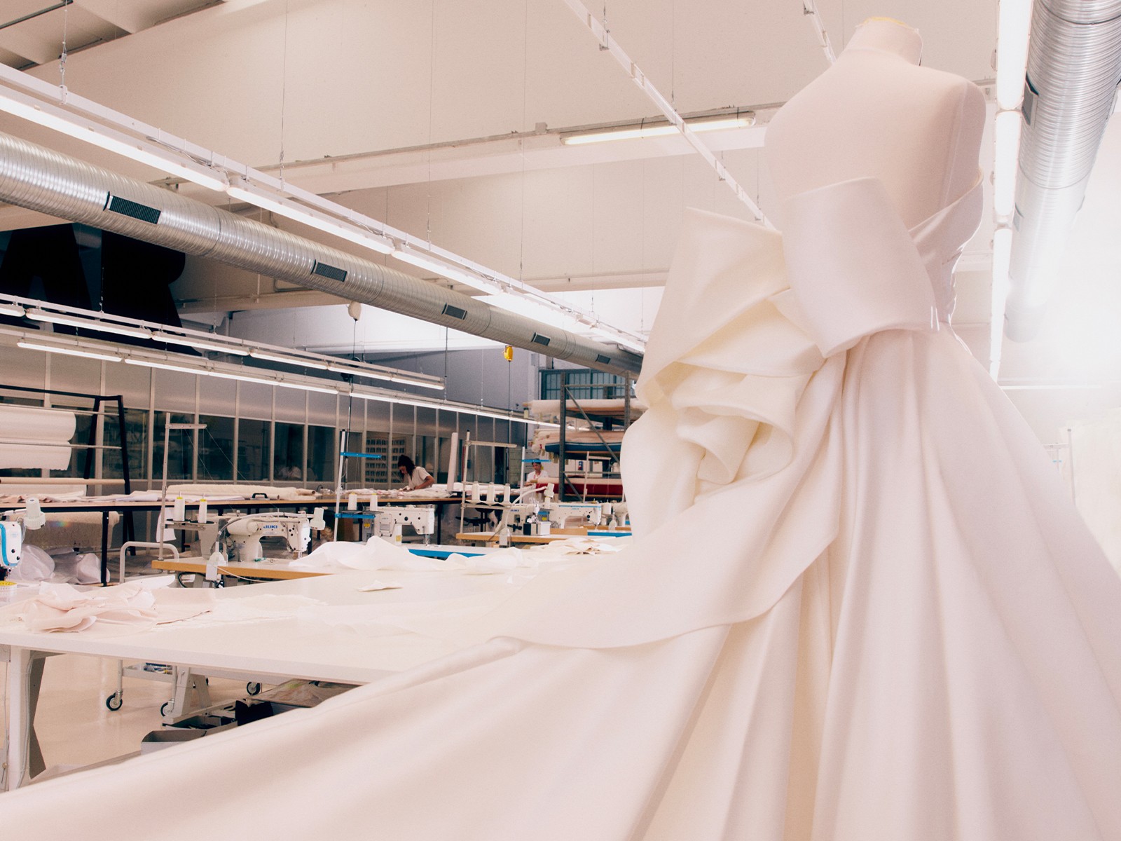 It is in Garlate, in the province of Lecco, that all the magic begins. Here the entire production cycle takes place. From hand-drawn patterns to the cutting of fabrics—silk mikado, organza, tulle, Valenciennes lace—every gesture is aimed at finding the ideal balance between volume, structure, and movement. Every seam, line, and fold is the result of the precision that characterizes the couture language of the Maison. At the center of it all are skilled professionals who, with their savoir-faire, convey knowledge built and passed down over time. With ApritiModa, visitors can discover how Antonio Riva’s sartorial genius takes shape.