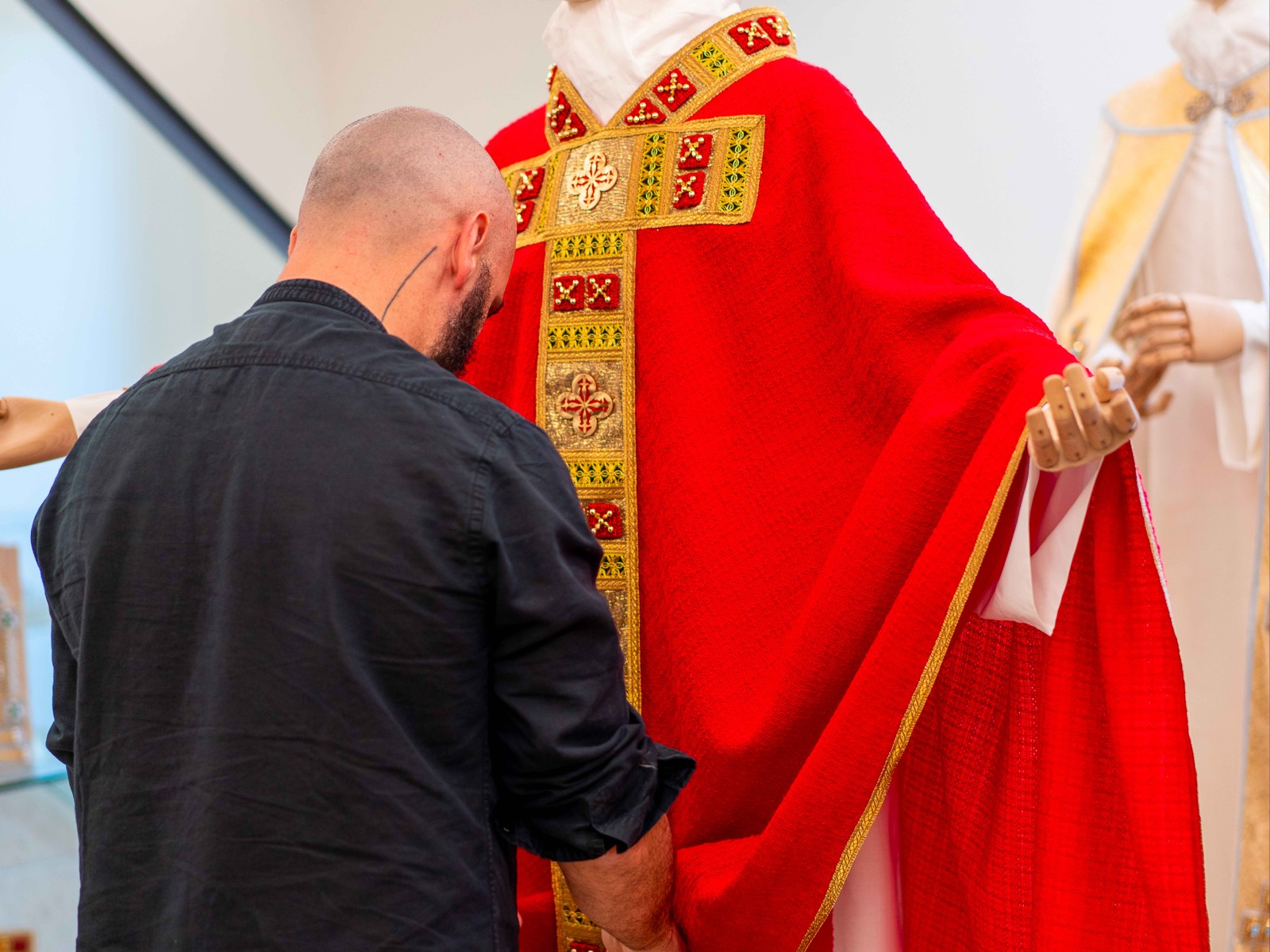 In the Santarcangelo atelier, where Sorcinelli works with twelve collaborators, visitors can see the workshop and observe the artisans at work. Everything they produce — vestments as well as liturgical furnishings and accessories — can then be admired in the showroom. Finally, two secrets will be revealed: how it is possible for the papal vestments to be both there and in the Vatican at the same time, and how a custom-made garment for a Pope is created without circling him with measuring tape and pins.