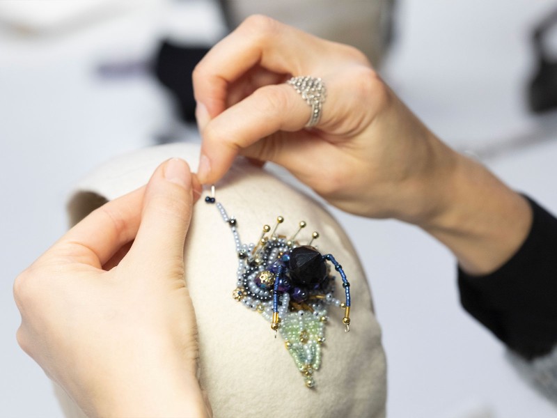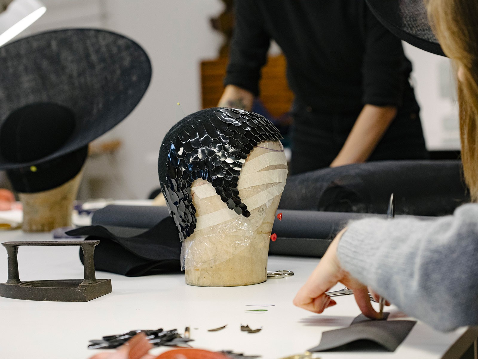 Si lavora su un progetto doppio, a Ilariusss. Ci sono le collaborazioni con i più prestigiosi brand internazionali della moda, da Versace a Vuitton, da Valentino a Max Mara: cappelli, cerchietti e copricapi realizzati secondo l’outfit che dovranno accompagnare, e in linea con l’evento nel quale dovranno essere indossati, che sia una sfilata o un red carpet, il Met Gala, un matrimonio regale o un funerale di Stato. E poi c’è la linea nella quale Ilaria Soncini esprime tutta sé stessa e tutta la passione che dall’Emilia l’ha portata a studiare a Milano, a realizzarsi a Berlino per poi tornare e aprire il suo atelier a Lambrate. Nascono così copricapo scultura come Endless, due serpenti allacciati che brillano in una danza intorno alla testa; i cappelli per il teatro, o le tese tagliate che sono un po’ il suo simbolo e la maschera che una giovane indiana ha voluto per festeggiare la laurea e che ha richiesto dieci giorni di lavoro congiunto di Ilaria, di Gemma, di Floriana e di Anaïs. Una crea, l’altra cuce; c’è chi taglia e chi ricama. Tutto, dal primo all’ultimo punto, fatto a mano. Quando al portone bussa una futura sposa è sempre una gioia: tra tutte le clienti, le spose sono quelle che osano di più; quando arriva una commissione da un brand, si sa che il lavoro sfilerà sotto una pioggia di flash. Modista? Cappellaia? Artista? Ilaria sceglie l’inglese “milliner”: «Nella radice ha “Milaner”, ovvero milanese». In definitiva, il cappellaio di Milano. Se non lei, chi?