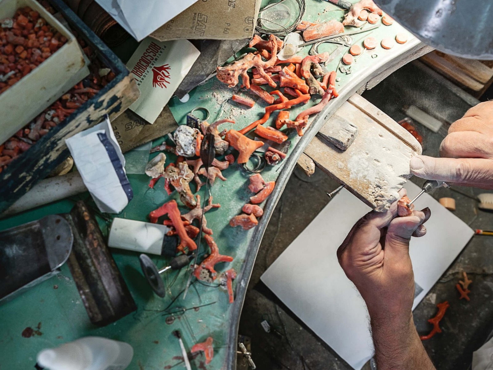 All’interno della storica gioielleria e bottega artigiana Rossocorallo a Trapani, l’orafo corallaio Platimiro Fiorenza tramanda l'antica arte della lavorazione del corallo da generazioni. Il laboratorio usa i metodi più peculiari e tradizionali per trattare corallo, avorio, perle, pietre preziose, argento e oro, rendendo omaggio all’artigianato e alla creatività dell’isola.